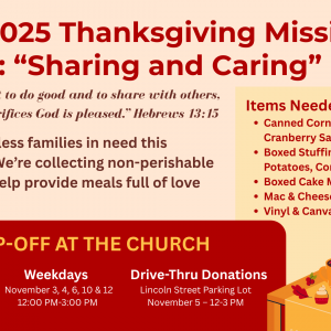 FBCH 2025 Thanksgiving Mission Project: “Sharing and Caring” As the season of gratitude approaches, First Baptist Church (FBCH) invites our church family and community to join together in love and service for our 2025 Thanksgiving Mission Project: “Sharing and Caring.” This year, our mission is simple but powerful — to be the hands and feet […]