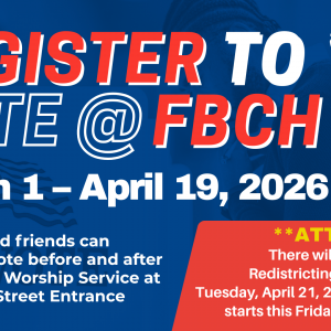 REGISTER TO VOTE @ FBCH March 1–29, 2026 Members and friends can register to vote before and after Morning Worship Service at the Lincoln Street Entrance. 📌 Important Dates:• Early Voting Begins: Friday, March 6, 2026• Redistricting Referendum Vote: Tuesday, April 21, 2026 Let’s stay informed. Let’s stay engaged. Let’s exercise our right to vote.