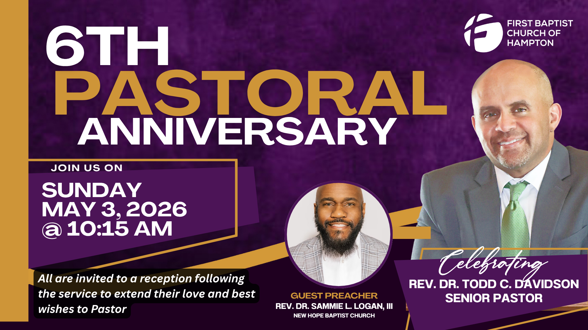 Pastor Davidson’s 6th Pastoral Anniversary Worship Service + Add to Google Calendar + iCal / Outlook export 00 days 00 hours 00 minutes 00 seconds Date May 03 2026 Time 10:15 am Location First Baptist Church of Hampton 229 N King St, Hampton, VA 23669 Share this event SearchSearchRecent PostsRecent Comments