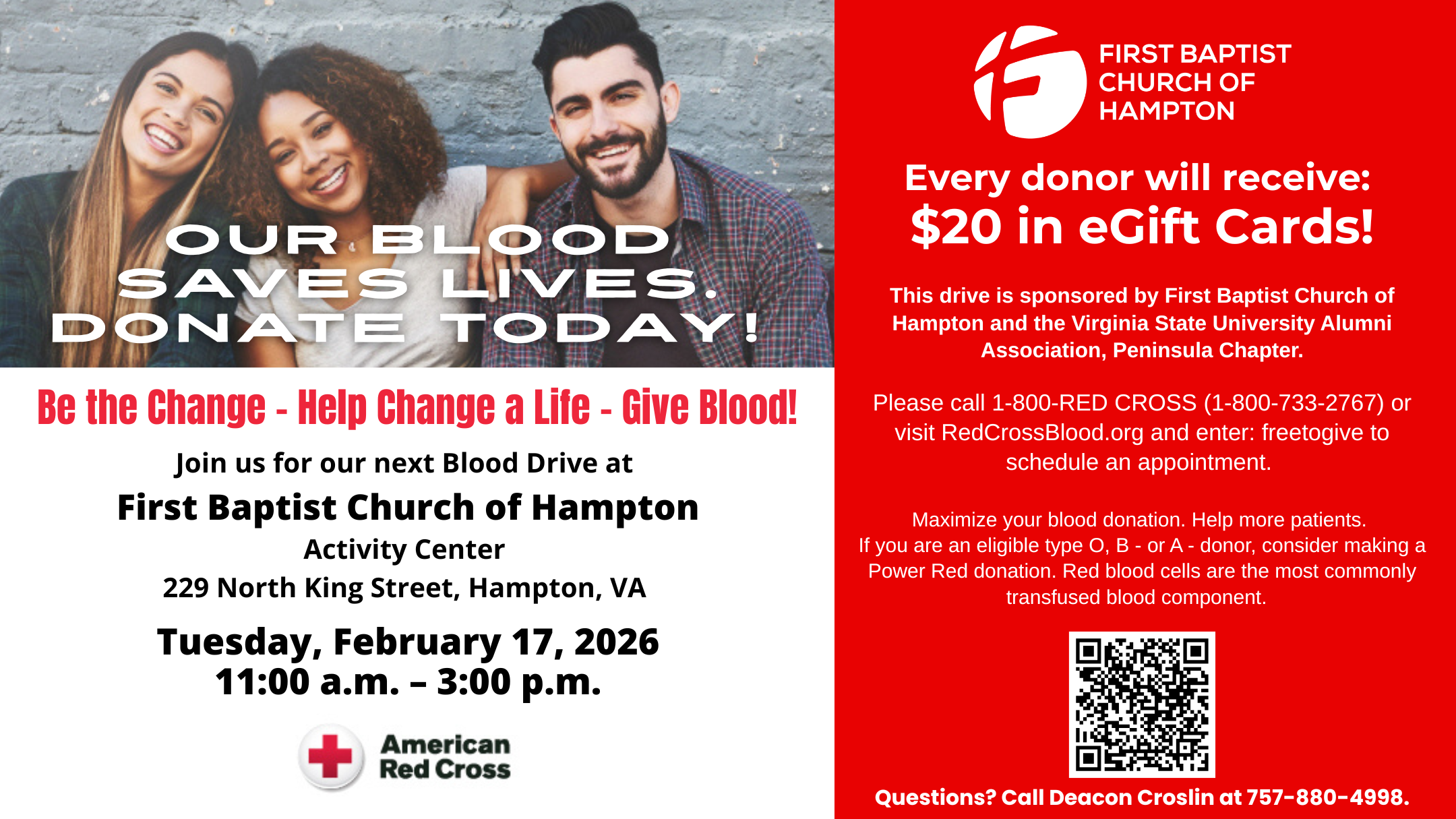 Red Cross Blood Drive + Add to Google Calendar + iCal / Outlook export 00 days 00 hours 00 minutes 00 seconds Date Feb 17 2026 Location FBCH Activity Center Share this event SearchSearchRecent PostsRecent Comments